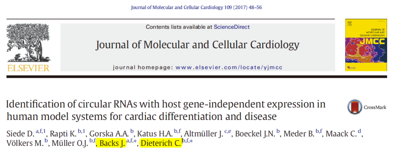 9. Siede, D., et al., Identification of circular RNAs with host gene-independent expression in human model systems for cardiac differentiation and disease. J Mol Cell Cardiol, 2017. 109: p. 48-56.