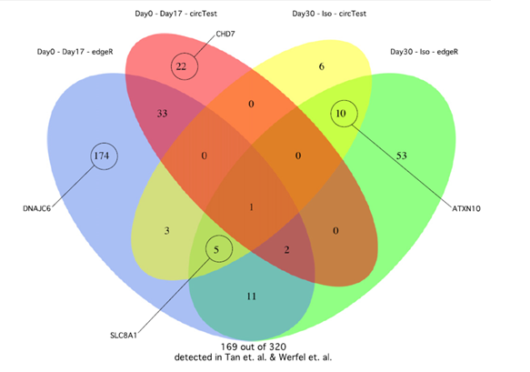 作者在基于大脑中动脉栓塞构建的小鼠中风模型中分析了6,12和24小时后半暗带皮质中circRNA的表达特征。实验基于芯片法分析,共获得了1320多种circRNA,其中1064种来源于外显子。283种在至少一个时间点表现出差异表达,16种在三个时间点都有同样趋势的变化[2]。本文是首次探索中风模型中circRNA的变化情况,从实验结果来看,circRNA的表达明显受到生理或病理刺激因素的影响。但美中不足的是,本文是基于芯片法分析的,并未针对各种circRNA所对应的线性RNA产物和转录本的表达变化进行分析,如果能找出伴随中风症状而特异性改变的circRNA或许更有意思。