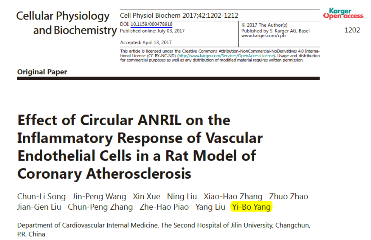 7月723日,Cellular Physiology and Biochemistry在线发表了吉林大学附属第二医院Song Chun-Li等作者的研究文章,介绍在大鼠冠状动脉硬化模型中发现circRNA ANRIL的功能,抑制circ-ANRIL表达可降低血管内皮细胞的凋亡及炎症性因子的分泌[10]。