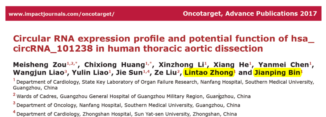 7月5日,Oncotarget杂志在线发表了南方医院Zhong Lintao和Bin Jianping为共同通讯作者的文章,介绍在人体胸主动脉夹层中circRNA差异表达分析的研究工作。表明circRNA_101238可抑制miR-320a的表达,影响MMP9的表达[11]。