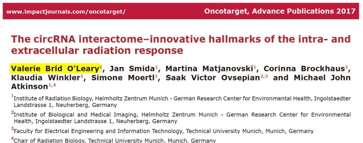 7月13日,Oncotarget杂志在线发表了亥姆霍兹中兴慕尼黑 – 德国环境卫生研究中心 Valerie Bríd O’Leary为通讯作者的文章,介绍在细胞内外辐射条件下细胞中circRNA表达变化情况[12]。