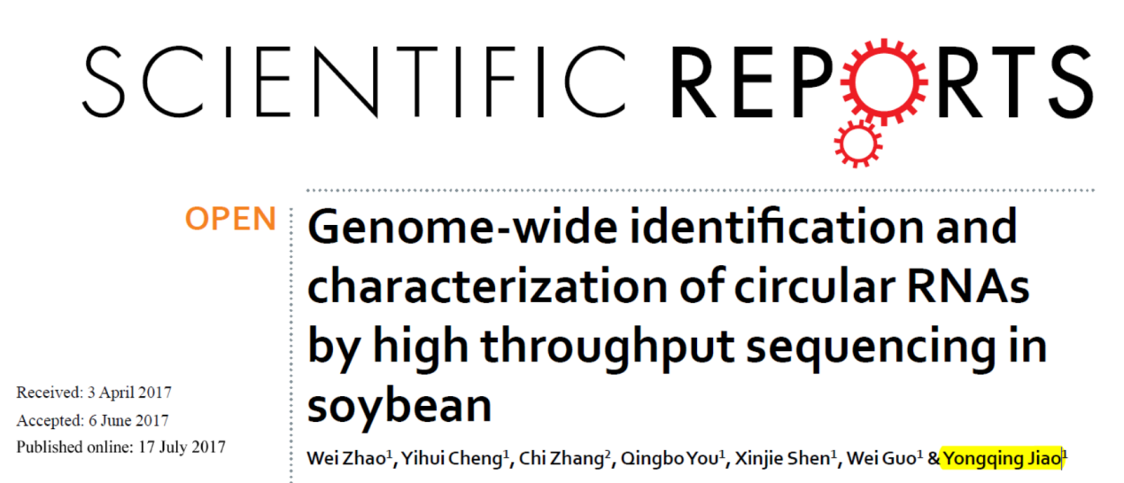 7月17日,Scientific Reports杂志在线发表了中国农业科学院油料作物研究所Jiao Yongqing为通讯作者的文章,介绍在黄豆中进行circRNA表达谱分析研究[13]。