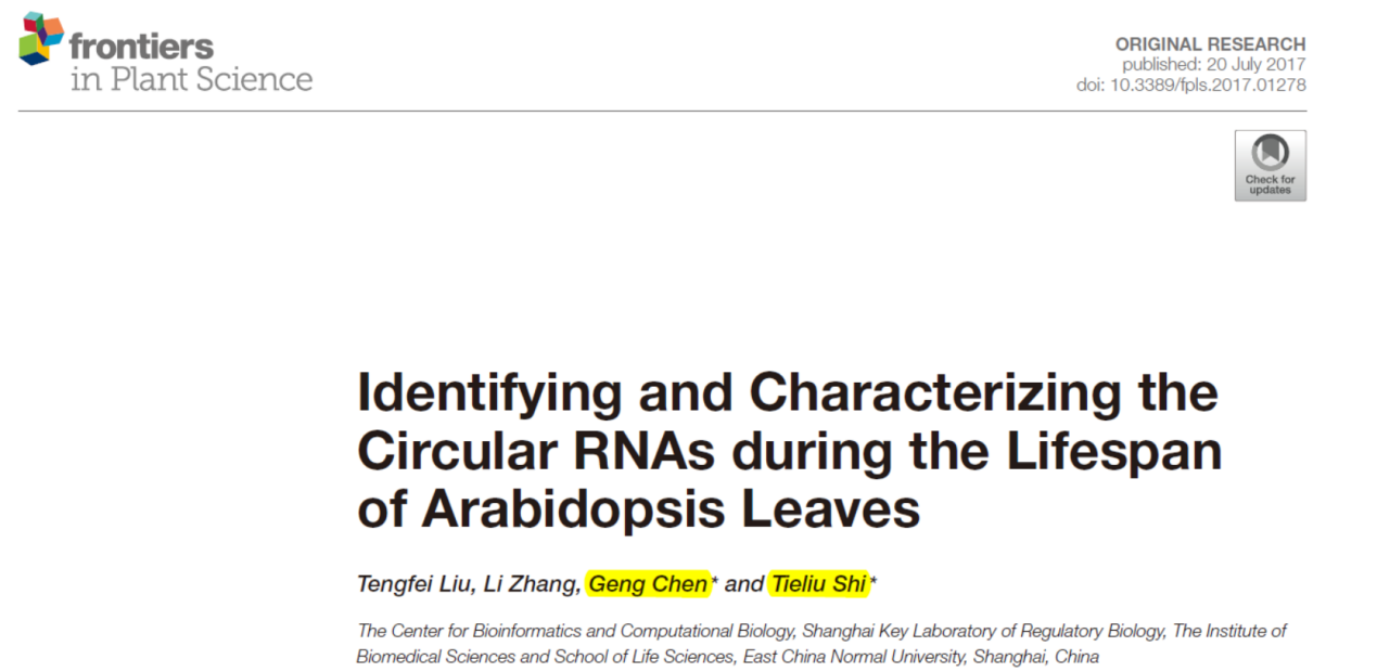 14. Tengfei Liu, L.Z., Geng Chen and Tieliu Shi, Identifying and Characterizing the Circular RNAs during the Lifespan of Arabidopsis Leaves. Frontiers in Plant Science, 2017.