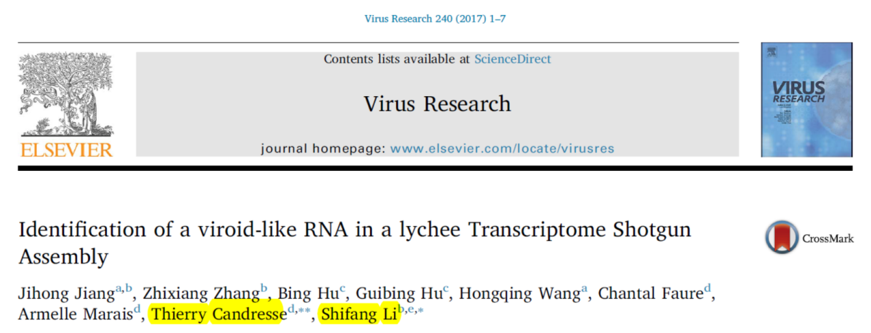 7月16日,Virus Research杂志在线发表了法国波尔多大学Thierry Candressed和中国农业科学院植物保护研究所李世访为共同通讯作者的文章,介绍在荔枝转录组中利用鸟枪法测序后分析植物类病毒的研究工作,其中许多的RNA产物为circRNA形式的分子[15]。