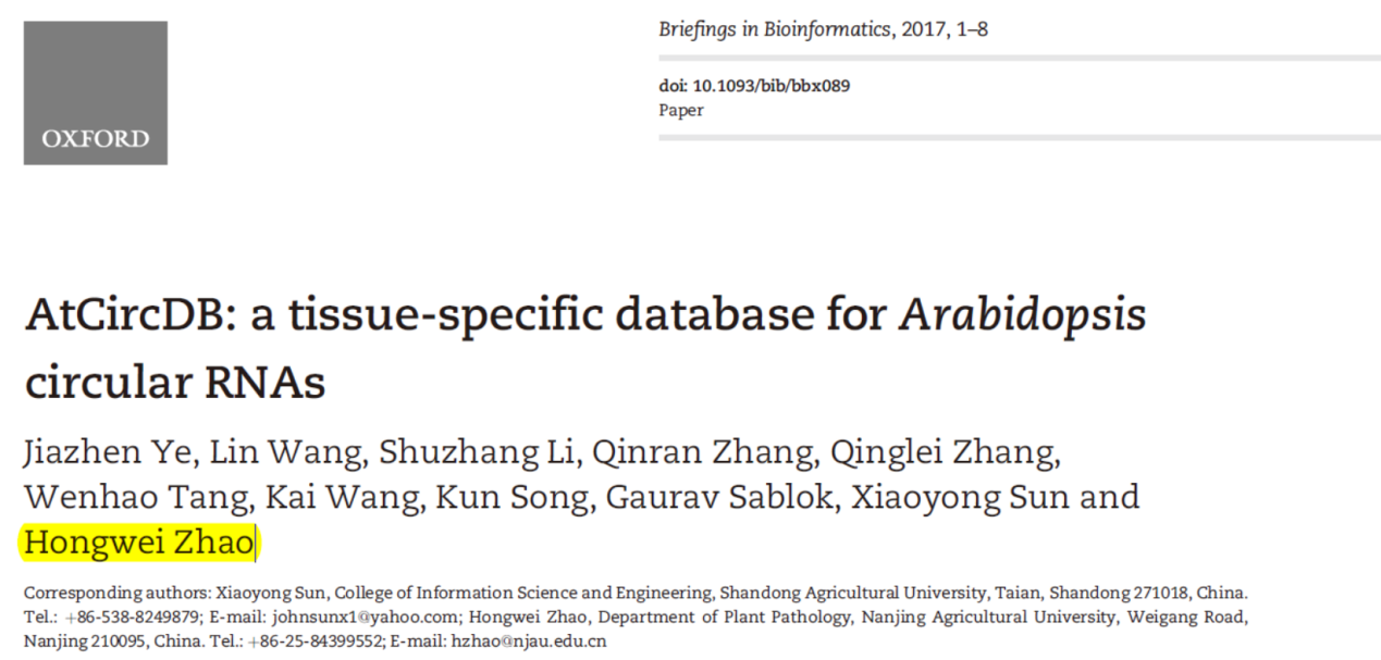 16. Jiazhen Ye, L.W., Shuzhang Li, Qinran Zhang, Qinglei Zhang, Wenhao Tang, Kai Wang, Kun Song, Gaurav Sablok, Xiaoyong Sun and Hongwei Zhao, AtCircDB: a tissue-specific database for Arabidopsis circular RNAs. Briefings in Bioinformatics, 2017.