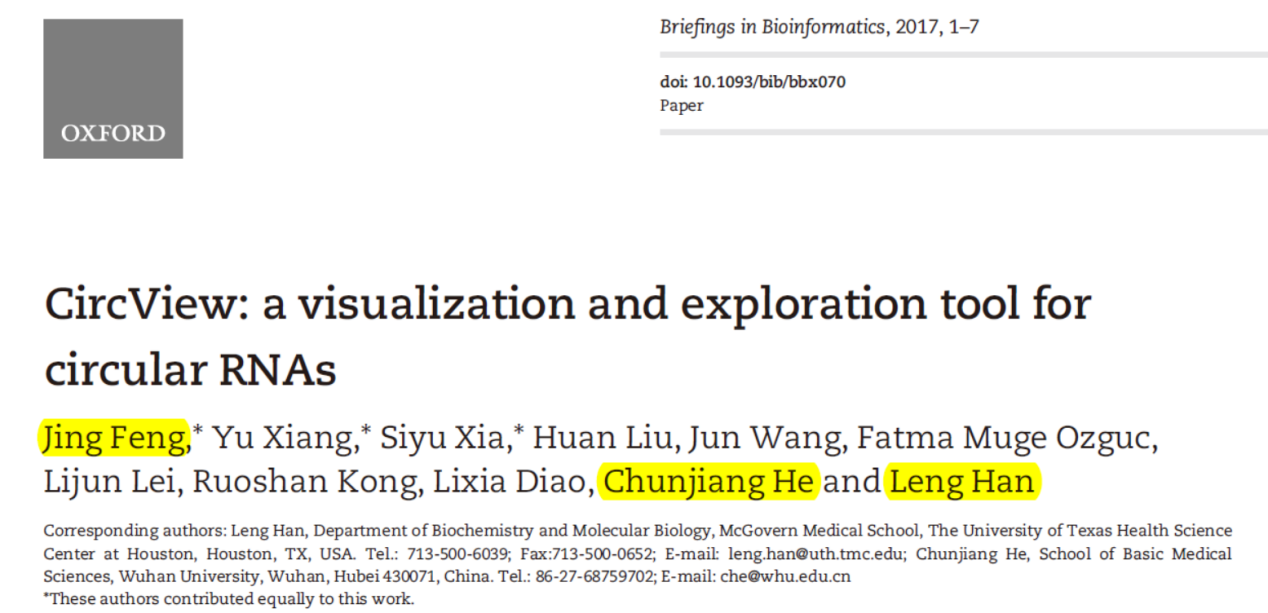 17. Jing Feng, Y.X., Siyu Xia, Huan Liu, Jun Wang, Fatma Muge Ozguc, Lijun Lei, Ruoshan Kong, Lixia Diao, Chunjiang He and Leng Han, CircView: a visualization and exploration tool for circular RNAs. Briefings in Bioinformatics, 2017.