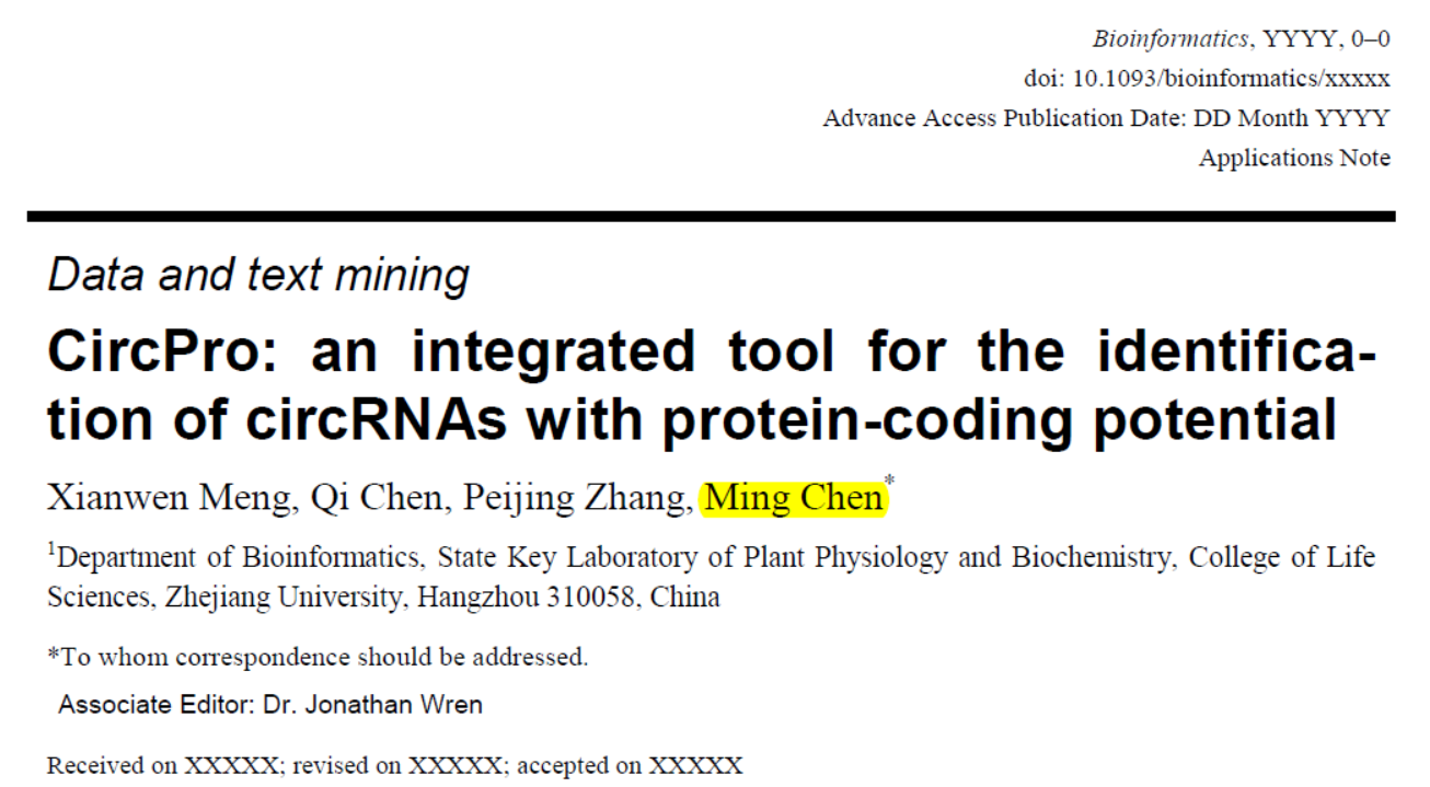 7月12日,Bioinformatics杂志在线发表了浙江大学生命科学学院陈铭教授的文章,介绍他们开发的一个预测分析circRNA翻译多肽的工具:CircPro,介绍了该工具的主要涉及思路并提供了下载地址 [18]。