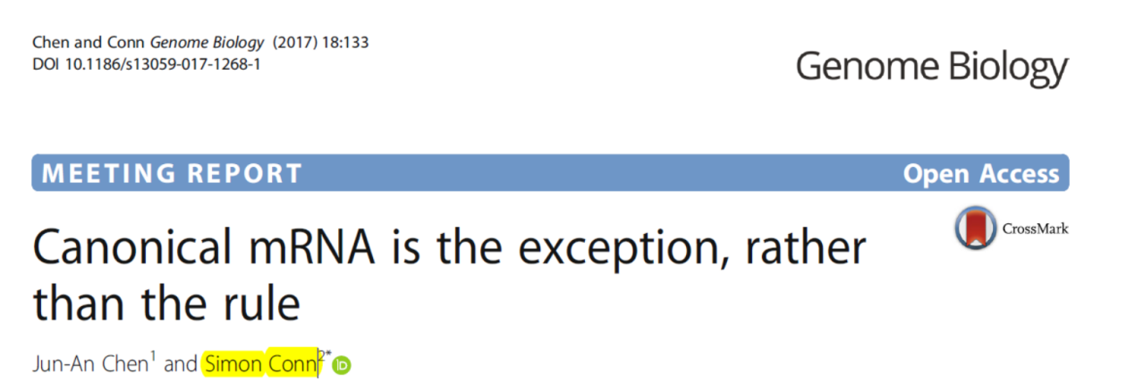 7月7日,Genome Biology杂志在线发表了南澳州大学Simon Conn为通讯作者的会议摘要,深入探讨了经典的mRNA及包括circRNA在内的ncRNA的关系,认为传统意义的编码RNA只是一种人为规定的定义,并非真正的自然规则。针对RNA编码或非编码的问题阐述了作者的观点。