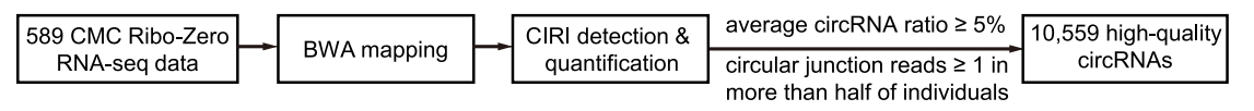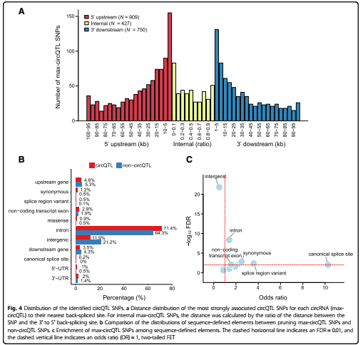 circQTL指与circRNA表达变化相关联的SNPs。文章对589例人背外侧前额叶皮质样品的circRNA进行了系统地分析,通过circRNA的表达与顺式调控 SNPs (cis-acting SNPs)关联分析,识别到了 196,255 个circQTL。