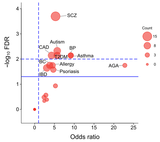 作者将所发现的circQTL SNPs 与GWAS Catlog 疾病与性状 SNP数据进行共定位,发现max-circQTL SNPs(与每个circRNA表达变化最显著关联的SNP)显著富集到了疾病相关的位点。并且与预期的一致,精神分裂症(SCZ)的关联位点最显著;其他比较显著的疾病还包括炎性肠病(IBD)和二型糖尿病(T2DM)。