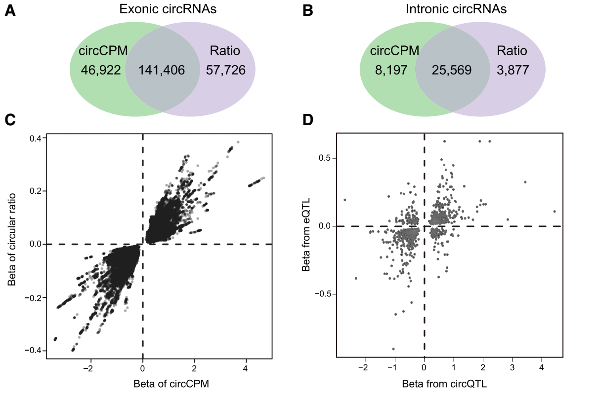 其中一个挑战是如何区分SNPs所调控的是circRNA表达(circQTL)还是宿主基因的表达(eQTL)。