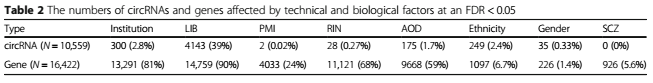 作者用limma包中的线性模型评估了技术性因素(Institution,文库构建批次LIB,死亡事件PMI,RNA完整性RIN值)以及生物因素(死亡年龄AOD,性别,SCZ)对circRNA表达改变的影响。