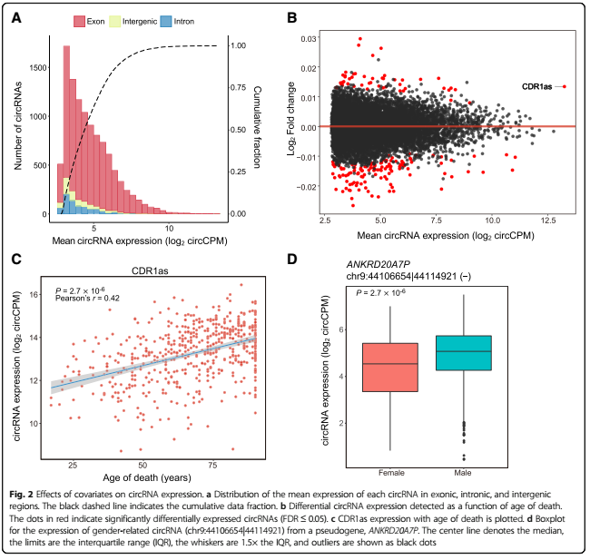 我们可以发现其中library batch即样本的文库大小对circRNA表达变化影响最大,达到了39%,说明它是一个关键的因子;另外发现了175个AOD相关的circRNA,其中有44个表达独立于宿主基因或位于基因间区,这些基因中包括了在脑中高表达的CDR1as——可能暗示了该circRNA在脑中的累积与衰老密切相关。
