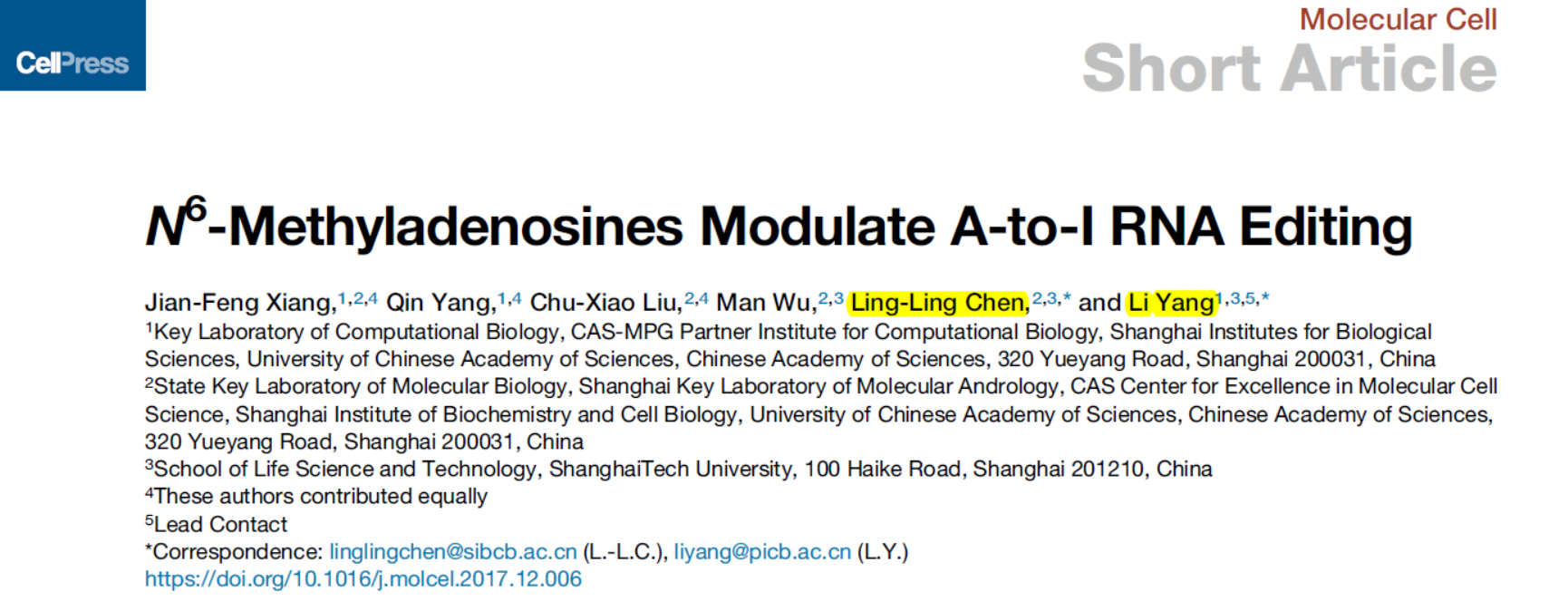 1月4日,RNA研究领域迎来2018年开门红,Molecular Cell杂志在线发表了陈玲玲教授和杨力教授为共同通讯作者的文章,介绍发现RNA的m6A修饰会负调控A-to-I修饰作用[1],对circRNA的研究有非常高的参考价值。