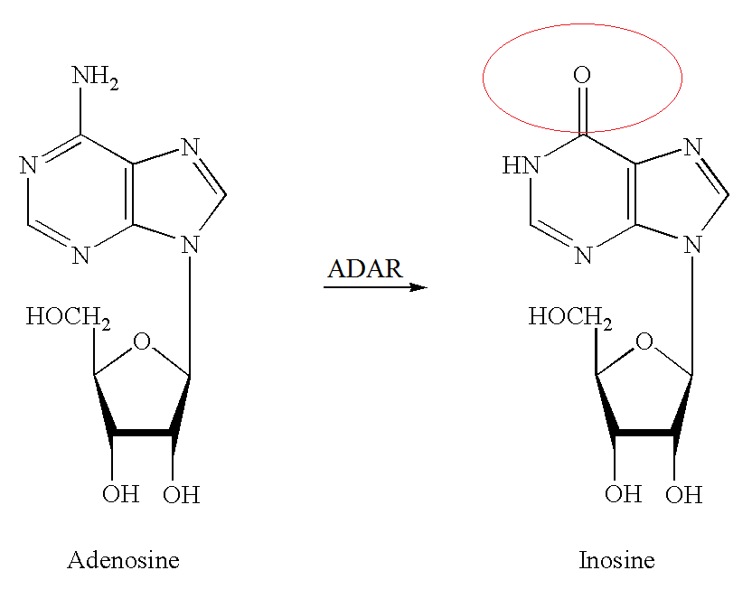 大量的研究报道发现RNA也有类似DNA和蛋白的化学修饰行为,目前已报道的有超过100种的RNA化学修饰方式,也有学者提出了表观转录组学(Epitranscriptome)的概念。包括RNA的各种甲基化修饰(如m1A,m6A,m5C等等),A-to-I修饰也是RNA的一种修饰方式,是在ADAR酶催化下将腺嘌呤核苷(A)脱氨基后转换为肌苷(I)的修饰过程。A-to-I修饰通常在双链RNA上进行,I碱基互补配对的碱基不再是T或U,而是C,因此这一修饰将明显改变原有核算序列的信息,可能在RNA翻译,高级结构以及RNA分子互作等方面有调控作用[2]。