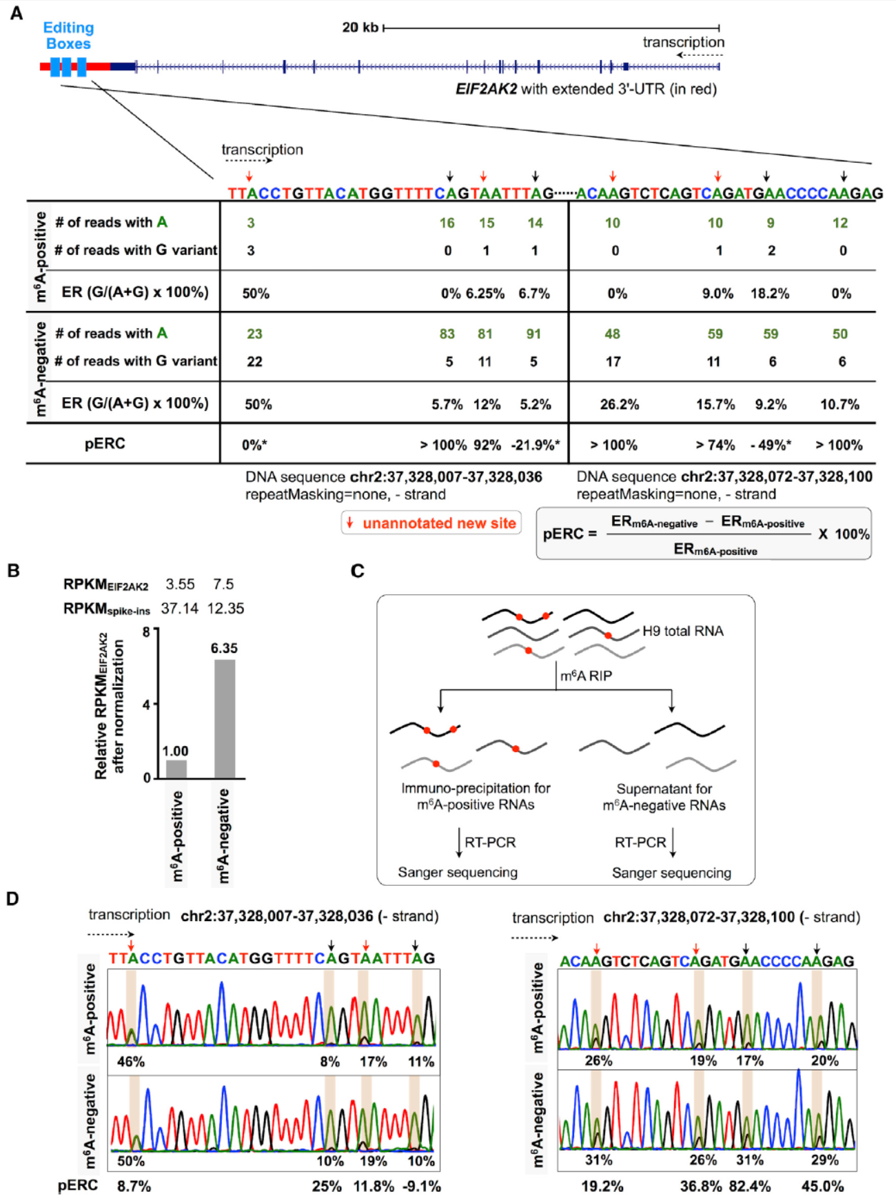 为进一步验证该现象,作者挑选了EIF2AK2基因的3’-UTR区进行分析。该基因的3’-UTR区有八个已报道的A-to-I修饰位点,验证实验中可以直接通过cDNA的一代测序,看相应位点的峰形比例确定被A-to-I修饰的比例。该研究中发现了其中的五个位点存在A-to-I修饰(H1细胞中)。与此同时,在EIF2AK2基因的转录产物更倾向于存在于m6A不修饰组。在H9细胞中进一步基于m6A RIP和反转录后cDNA的一代测序,表明其中的七个位点存在明显的A-to-I修饰,且更集中在m6A不修饰的组中。