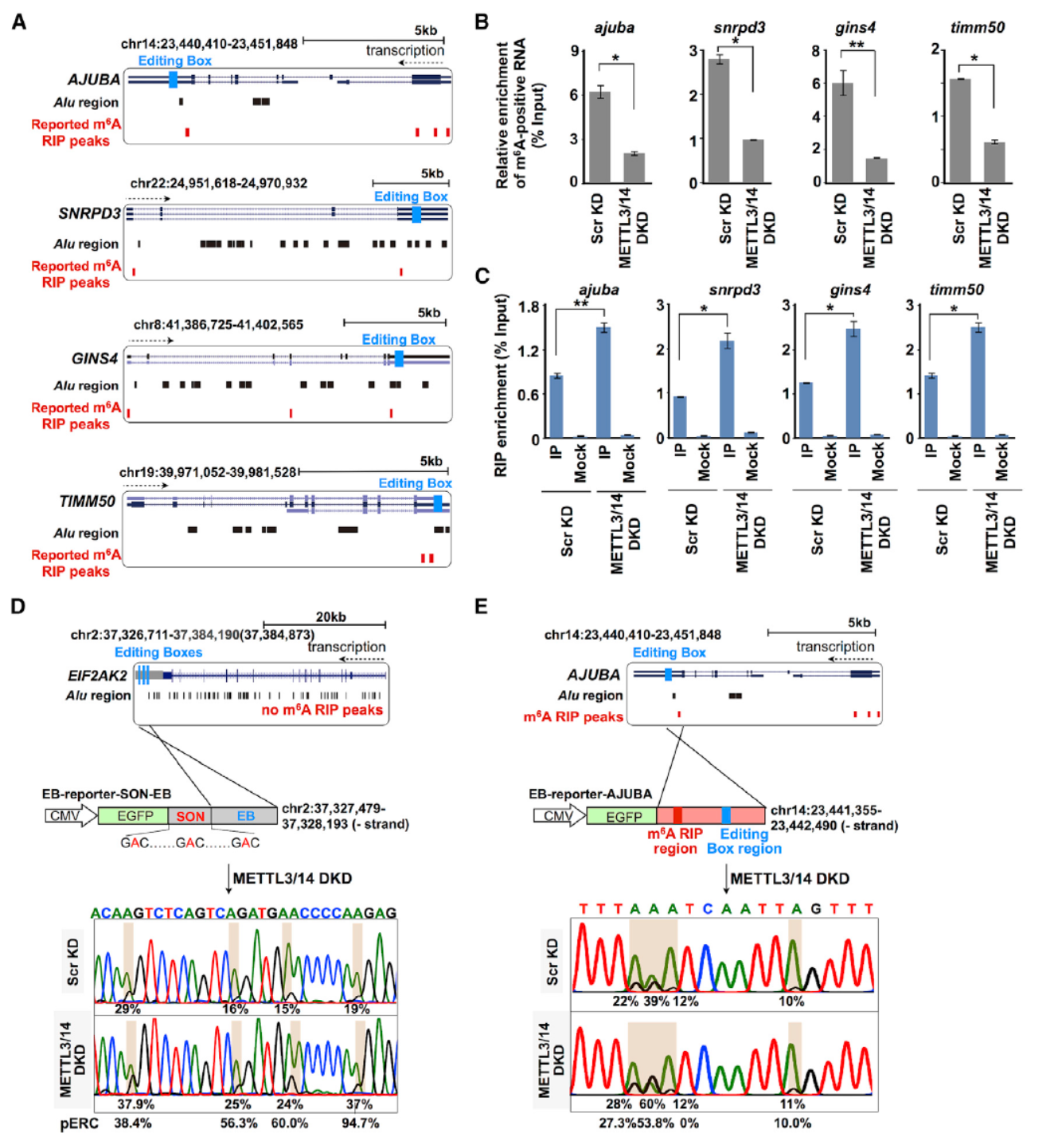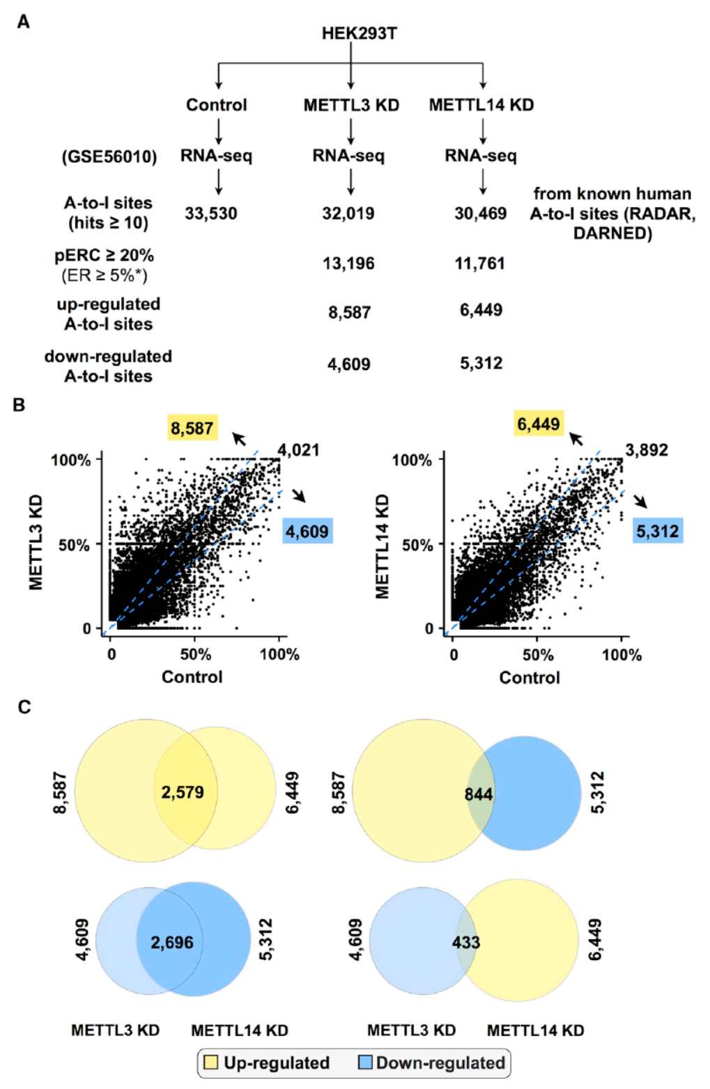 以上的数据表明两种修饰方式之间存在关联,但还不能证明两种修饰方式之间存在直接的相关性,也可能是一些未知原因导致的伴随现象。为进一步分析两种修饰之间的关系,有效的方法是针对一种修饰方式进行抑制,看是否会对另一种产生影响。m6A修饰的修饰酶(METTL3 和METTL14)和去修饰酶(FTO 和ALKBH5)是都是已知的,针对这些修饰酶进行干扰是最简单有效的选择。因此作者首先针对METTL3 和METTL14分别进行了Knock-Down分析,从相关研究背景分析来看,两种基因的KD并不影响ADAR的表达,说明所观察的变化不是由于影响了ADAR酶的表达量导致的。分析结果表明METTL3 和METTL14 干扰之后会不同程度的影响A-to-I修饰的情况,总体表现为上调该修饰方式,但两种基因的KD后所影响的基因也会有所差别,原因不明。