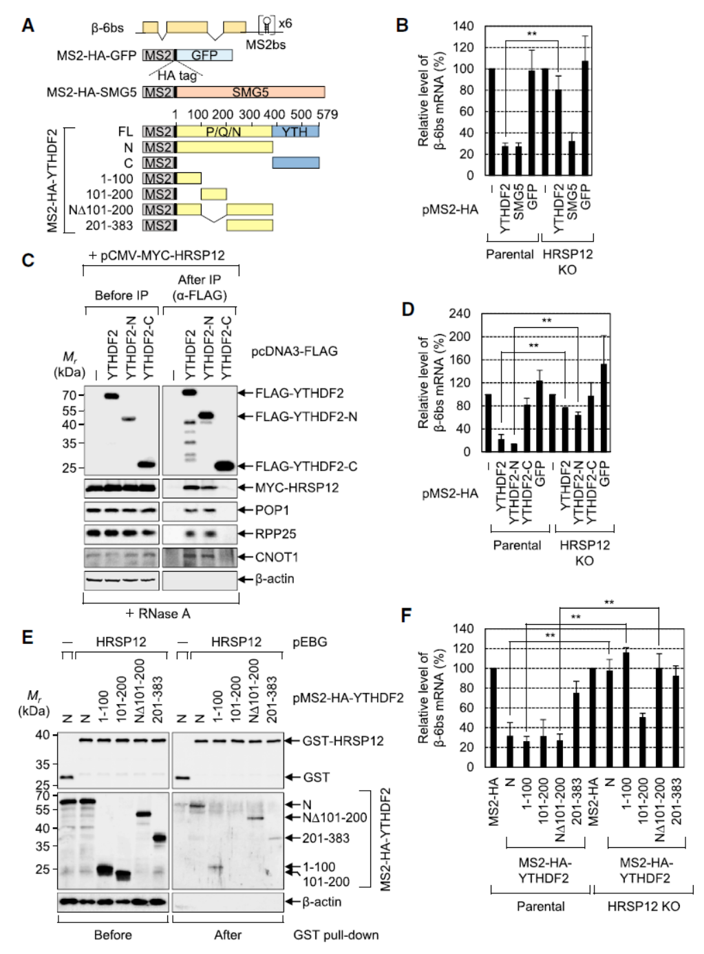 为弄清楚YTHDF2与HRSP12相互作用的位点,作者构建了截短突变体及基于MS2的β-6bs报告载体,将MS2序列融合于β-6bs报告分子的3’-UTR,MS2识别蛋白分别于不同的YTHDF2截短突变体或SMG5融合,这样可以借助MS2及其识别蛋白强制将靶分子募集于β-6bs报告分子的3’-UTR,通过分析β-6bs报告分子的丰度可监测相关分子是否具有促进靶分子降解的作用。在HAP1细胞中过表达SMG5或YTHDF2均能显著降低报告分子的丰度,但在HRSP12-KO的HAP1细胞中,过表达YTHDF2不能加速报告分子的降解,这表明在该模型中能够有效的分析m6A介导的基于YTHDF2和HRSP12的RNA降解作用。