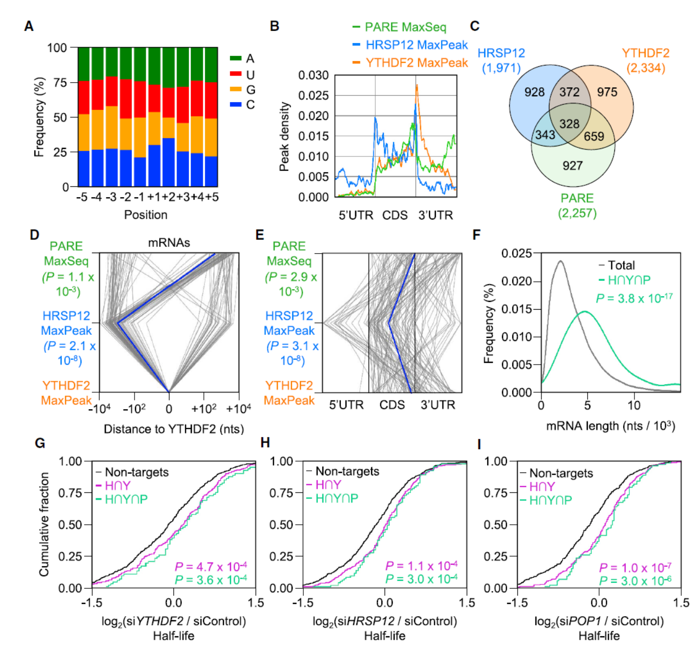 PARE-seq(parallel analysis of RNA ends sequencing)可以分析内切核酸酶的切割位点,借助这一技术,作者分析了YTHDF2识别位点,HRSP12结合位点及RNase P/MRP切割位点的分布情况。结果表明HRSP12结合位点和RNase P/MRP切割位点分别位于YTHDF2识别位点的上游和下游。YTHDF2和HRSP12协同促进相互结合RNA分子,并促进基于RNase P/MRP的RNA内切和降解。