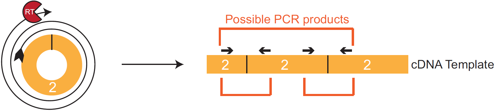 图5 以circRNA exon2示例滚环转录和cDNA模板,可能的PCR产物会跨越3个exon2的序列,序列内两个Splice Junction中间即为 circRNA exon2的全长(Barrett SP et al., 2016)。