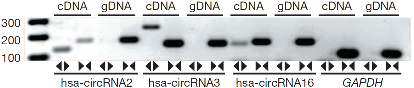 图1 分别使用Divergent Primer和Convergent Primer在cDNA和gDNA中检测hsa-circRNA2、hsa-circRNA2、hsa-circRNA2和GAPDH。在cDNA中以Divergent Primer能检测到对应大小的条带,以Convergent Primer检测到的条带大小不同;在gDNA中以Divergent Primer检测不到对应大小的条带,表明circRNA是反向成环的(Memczak S et al., 2013)。
