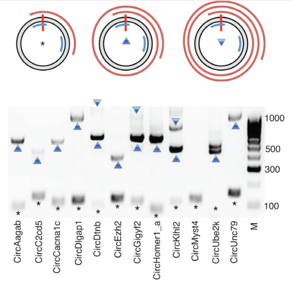 图4 上半部分星号代表未滚环的转录,蓝色向上箭头代表滚环+1圈的转录,蓝色向下箭头代表滚环+2圈的转录,红色曲线代表转录产生的cDNA。下半部分为电泳检测PCR产物条带,除circMyst4外都有滚环产物的条带(You X et al., 2015)。