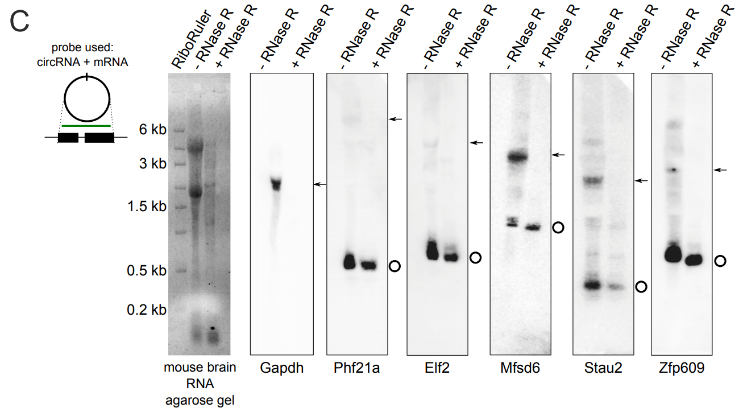 图2 Northern blot同时使用circRNA和mRNA探针(Rybak-Wolf, A. et al., 2015)
