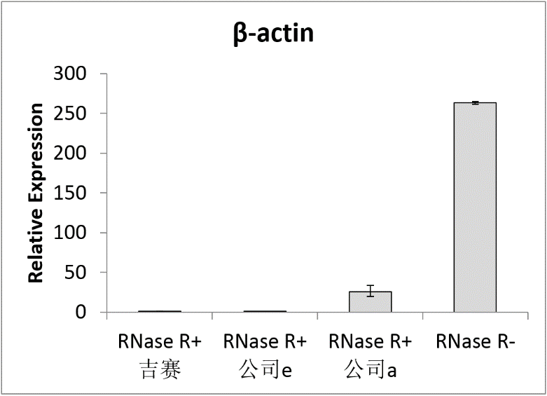 应用于RNase R消化前后或处理与不处理组的对比,PCR检测的常用内参ACTB或GAPDH都因被消化而不能使用。此时可将原始的RNA样品等分为两份,一份经RNase R消化(RNase R+),另一份不处理(RNase R-),以RNase R-组的内参作为计算标准。