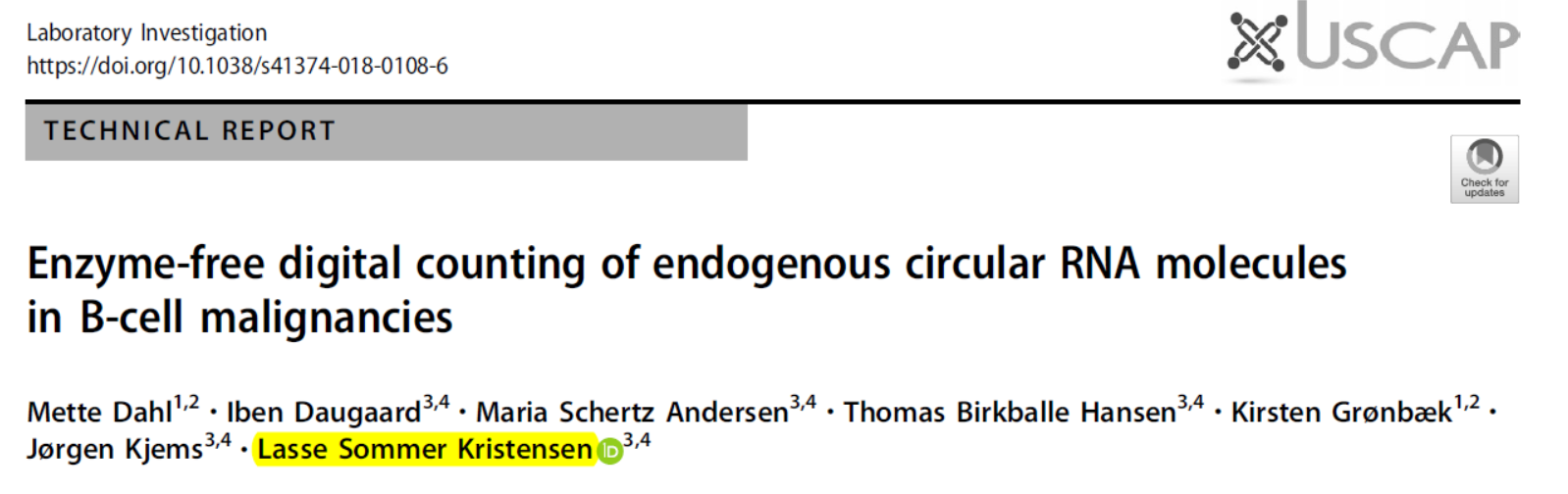 1. Mette Dahl, I.D., Maria Schertz Andersen, Thomas Birkballe Hansen, Kirsten Grønbæk, Jørgen Kjems, Lasse Sommer Kristensen, Enzyme-free digital counting of endogenous circular RNA molecules in B-cell malignancies. Laboratory Investigation, 2018.