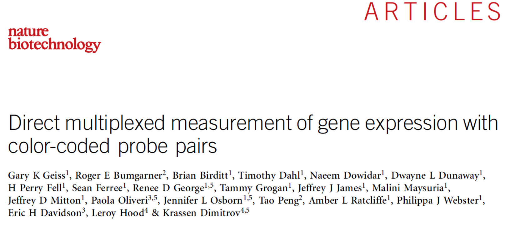 NanoString nCounter 荧光条形码标记检测技术对于大部分人可能还是比较陌生的,这个技术是美国NanoString公司的专利技术,曾经在2008年发表了Nature Biotechnology文章[2],感兴趣的读者可以去看看。