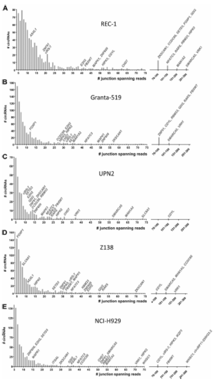 首先基于RNA-seq分析了五种B细胞恶性肿瘤的circRNA表达情况,挑选了每个junction point位点Reads数大于5的列出来: