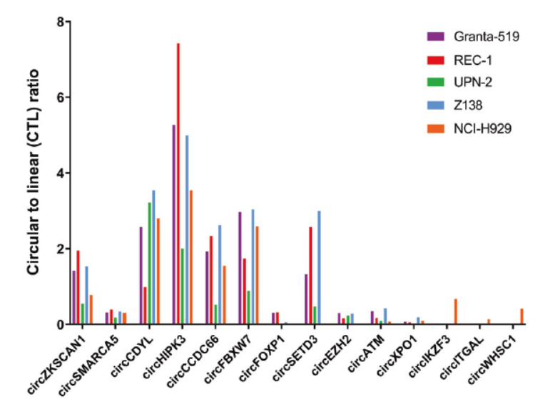 其中有多种circRNA的表达明显高于对应的线性RNA的(circular to linear ratio, CTL ratio),具体的也列出了下表: