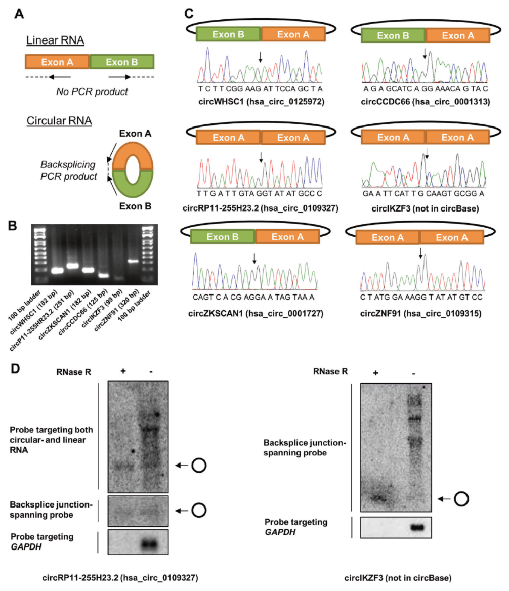 针对几个circRNA也进行了RT-PCR和Sanger测序鉴定,也做了RNase R消化前后的Northern鉴定: