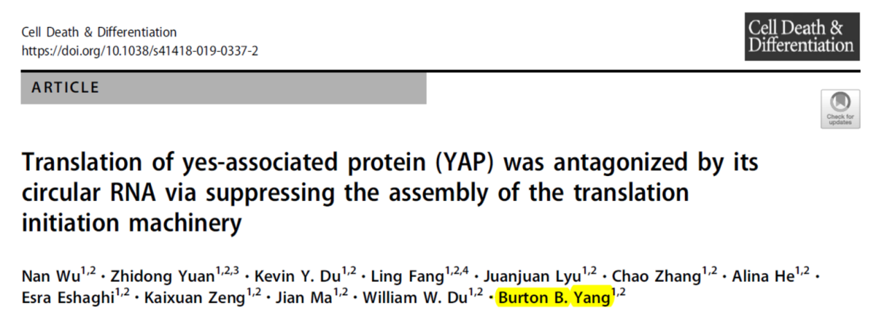 1. Nan Wu, Z.Y., Kevin Y. Du, Ling Fang, Juanjuan Lyu, Chao Zhang, Alina He, Esra Eshaghi, Kaixuan Zeng, Jian Ma, William W. Du, Burton B. Yang, Translation of yes-associated protein (YAP) was antagonized by its circular RNA via suppressing the assembly of the translation initiation machinery. Cell Death & Differentiation, 2019.