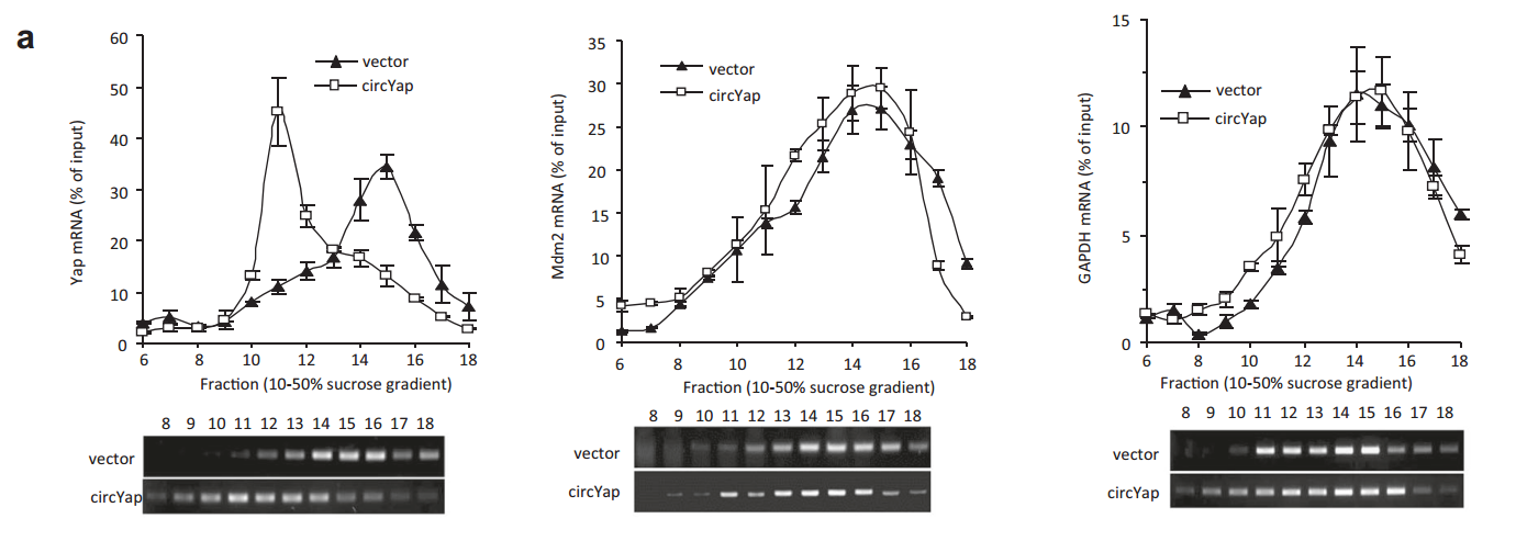 蔗糖密度梯度离心可以有效分离亚细胞组份,该技术可实现对结合单个核糖体的(monosome)和多个核糖体(polysome)的mRNA实现有效分离,常用于mRNA翻译研究。为进一步分析circYAP如何调控YAP蛋白表达水平的机制,作者用蔗糖密度梯度离心分离monosome和polysome,收取不同蔗糖密度层组分后PCR分析YAP mRNA的分布状态。结果发现过表达circYAP后,YAP的mRNA呈现显著的位移,表现为低密度对应的组分中YAP mRNA明显增多,而另外两种mRNA(MDM2和GAPDH)没有这种现象。这说明circYAP过表达后,结合在YAP mRNA上的核糖体数目显著降低,更多倾向于monosome状态。这一实验结果暗示circYAP很有可能是影响了YAP mRNA翻译起始状态,阻碍了核糖体有效组装和往下游的滑动翻译。