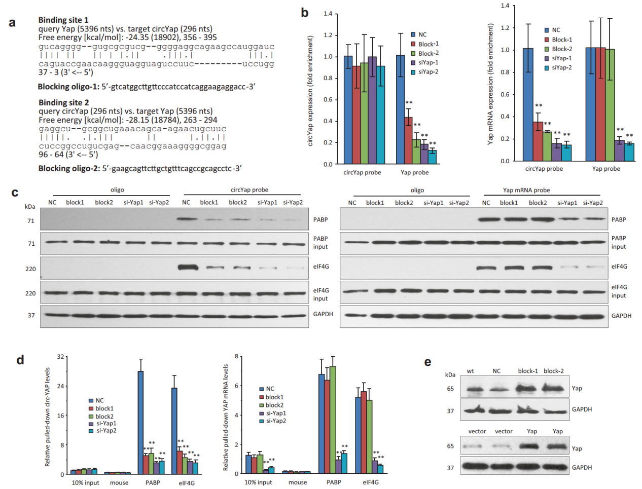 上述结果充分证明了circYAP,YAP mRNA与eIF4G和PABP的相互作用关系,接下来需要弄清楚circYAP分别通过什么序列与eIF4G和PABP相互作用的。作者的做法是基于生物信息学预测分析后设计封闭探针,然后验证相关相互作用被影响的情况。作者用RIsearch和RNAplex工具预测了circYAP与eIF4G和PABP相互作用位点的序列,分析到了两个打分比较高的序列区段,然后针对这两个区段分别设计了封闭探针。