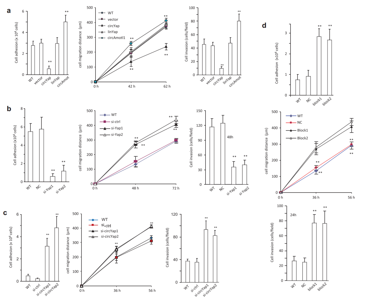 circYAP抑制肿瘤迁移,侵袭,封闭探针可抑制circYAP在这方面的功能。