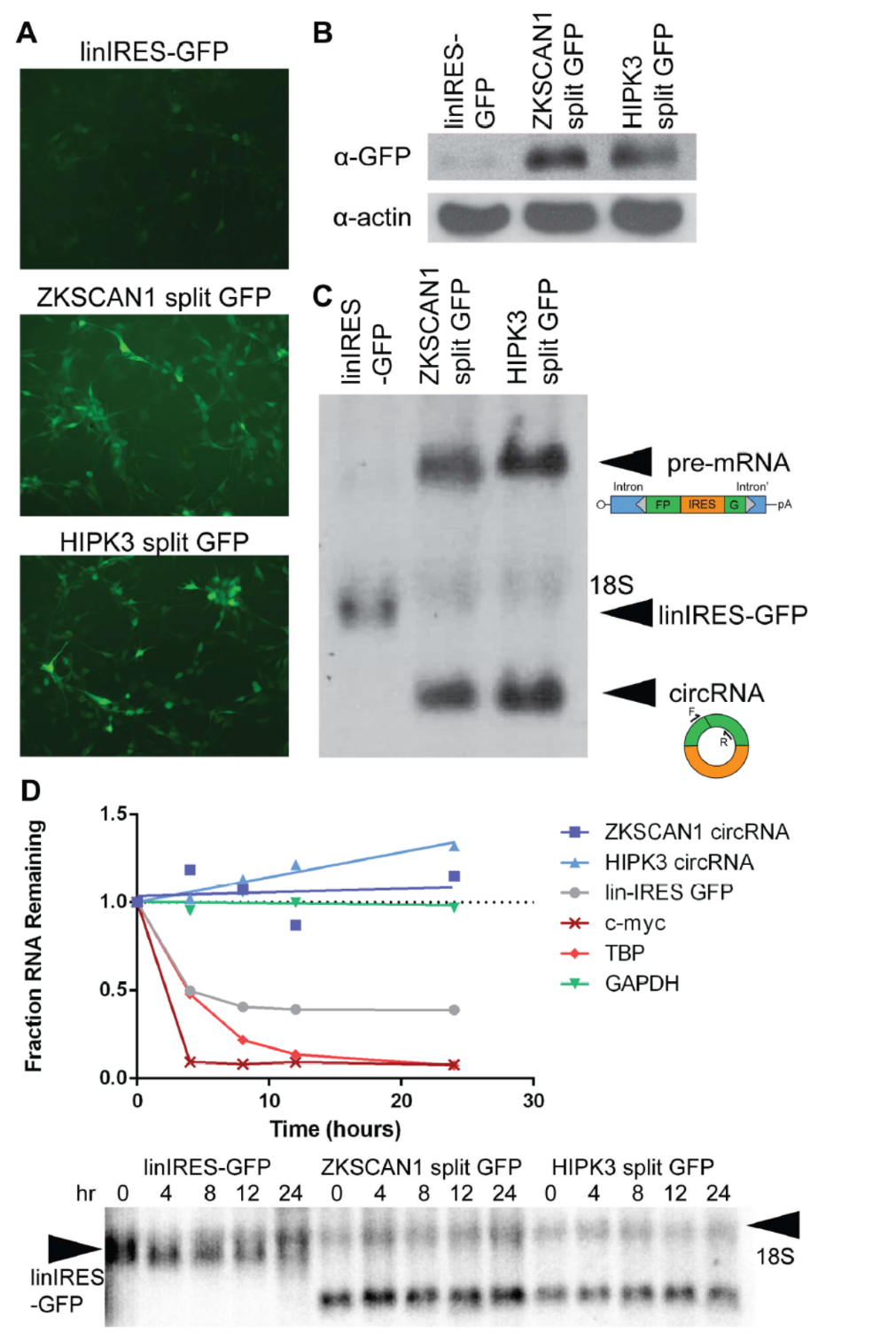 为证明所设计的载体能够正确表达circRNA并能准确翻译蛋白,作者将所构架的载体包装后感染U87细胞,免疫荧光和Western检测证明基于ZKSCAN1和HIPK3基因环化的内含子构建的circRNA过表达载体均能成功表达出GFP蛋白,线性的对照载体几乎没有信号。Northern实验证明了circRNA和前体分子的存在。利用转录抑制剂放线菌素D(Actinomycin D)处理实验证明细胞内circRNA比线性RNA更稳定。