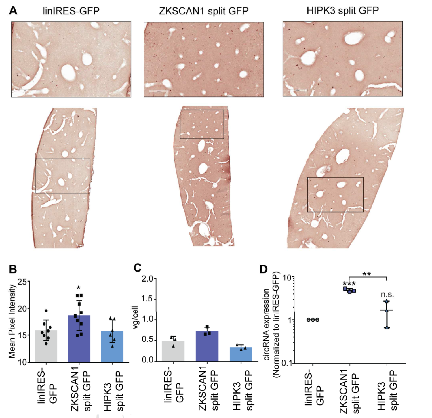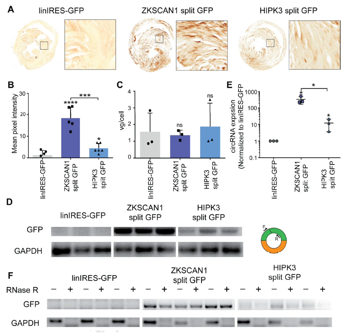 载体采用CMV启动子,SV40的PolyA信号序列。分别基于ZKSCAN1和HIPK3基因形成环状RNA 的内含子序列构建circRNA表达体系。为验证所表达的circRNA能够在环化后翻译蛋白,作者利用了拆分的GFP的ORF进行验证(该体系为中科院计算所王泽峰教授团队设计的),只有正确环化的circRNA才能形成完整的GFP的ORF并表达出GFP蛋白。为了排除线性RNA翻译的可能性,作者还构建了线性的RNA对照,即不包含可环化的内含子序列的载体对照。