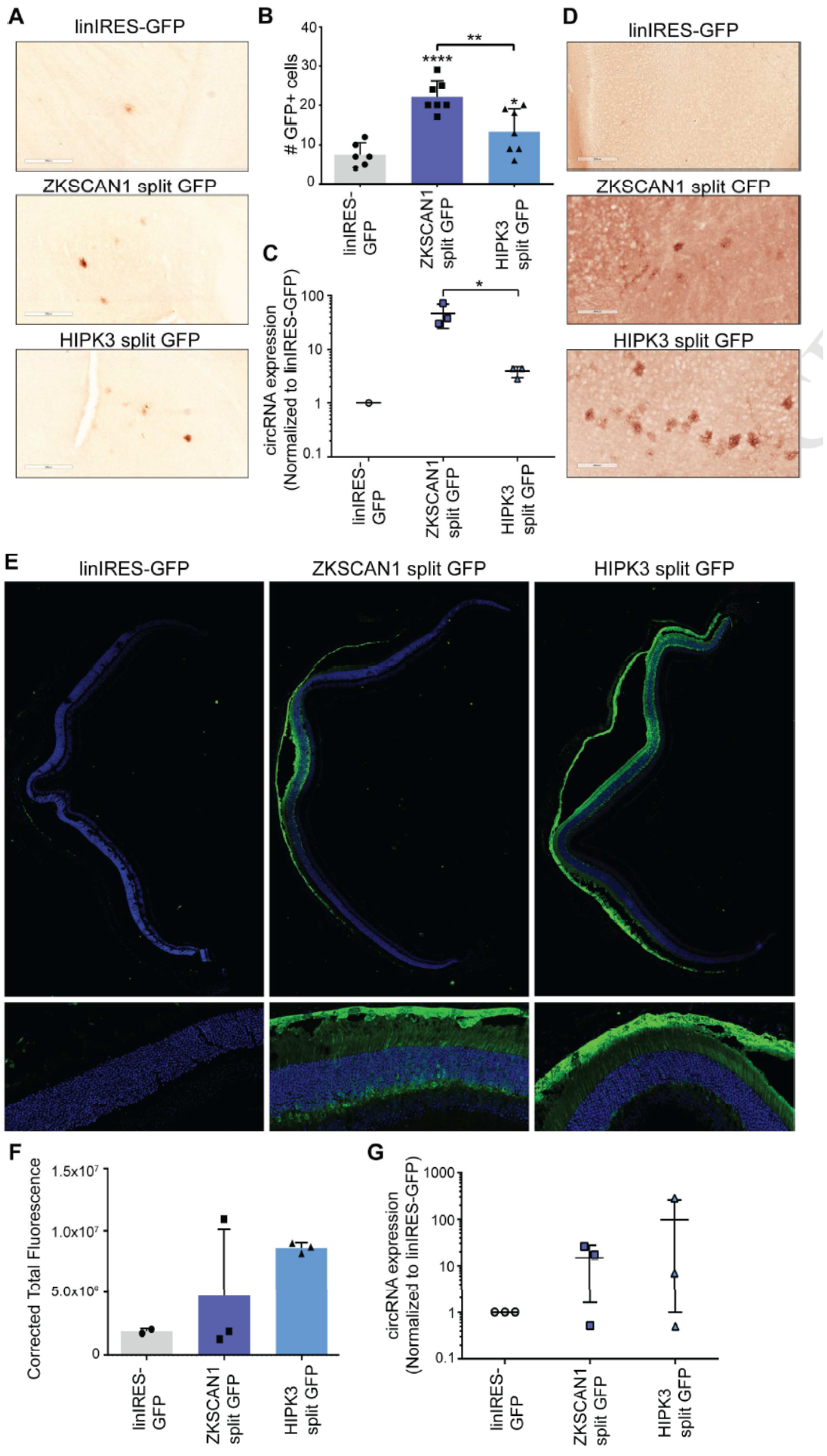 作者也分别在脑组织和眼组织中分析了所构建的AAV载体是否能准确表达circRNA并翻译。在上述的静脉注射模型中,作者在脑组织中发现该体系更容易在星形胶质细胞中表达,偶尔有一些神经元中也可以观察到。当更换为直接脑室注射的模型,观察后表明星形胶质细胞中表达也明显高于其他类型的脑组织细胞。眼球玻璃体内注射AAV病毒后观察,结果表明所构建的载体可以准确的在视网膜截面中表达。