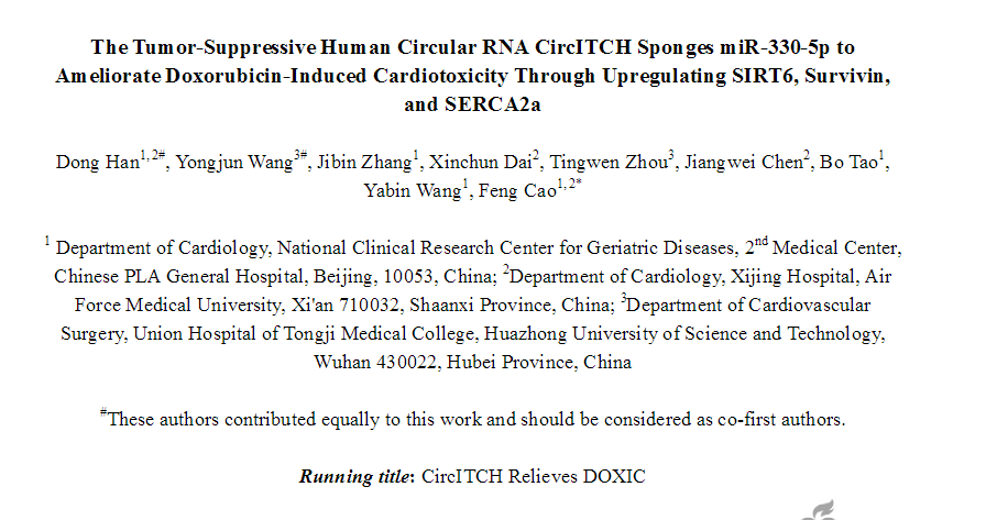 2020年5月11日,中国人民解放军总医院的曹丰教授在Circulation Research(IF=15.862)杂志上发表了一篇题为“The Tumor-Suppressive Human Circular RNA CircITCH Sponges miR-330-5p to Ameliorate Doxorubicin-Induced Cardiotoxicity Through Upregulating SIRT6, Survivin, and SERCA2a ”的文章,阐述 CircITCH,一种抑制肿瘤的广谱环状RNA,通过调节miR-330-5p-SIRT6/Survivin/SERCA2a轴来减轻阿霉素诱导的心脏毒性([1])。