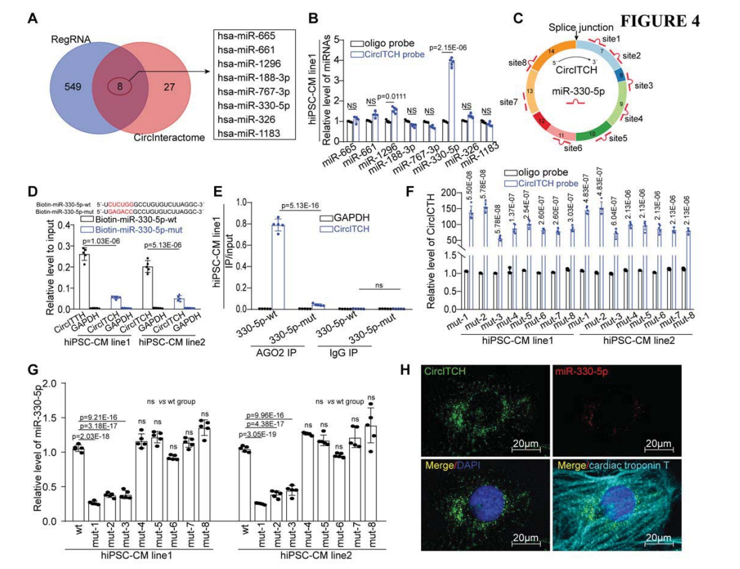 为了更准确地了解miR-330-5p与CircITCH之间的结合活性,作者利用生物信息学工具RNA hybrid来预测miR-330-5p与CircITCH之间的结合位点,在CircITCH序列中预测了8个潜在的结合位点。之后对CircITCH过表达构建体中的每个预测结合位点进行了突变,检测CircITCH探针拉拽miR-330-5p的效率。结果表明,结合位点1、2和3是hiPSC-CM中CircITCH与miR-330-5p结合所必需的。