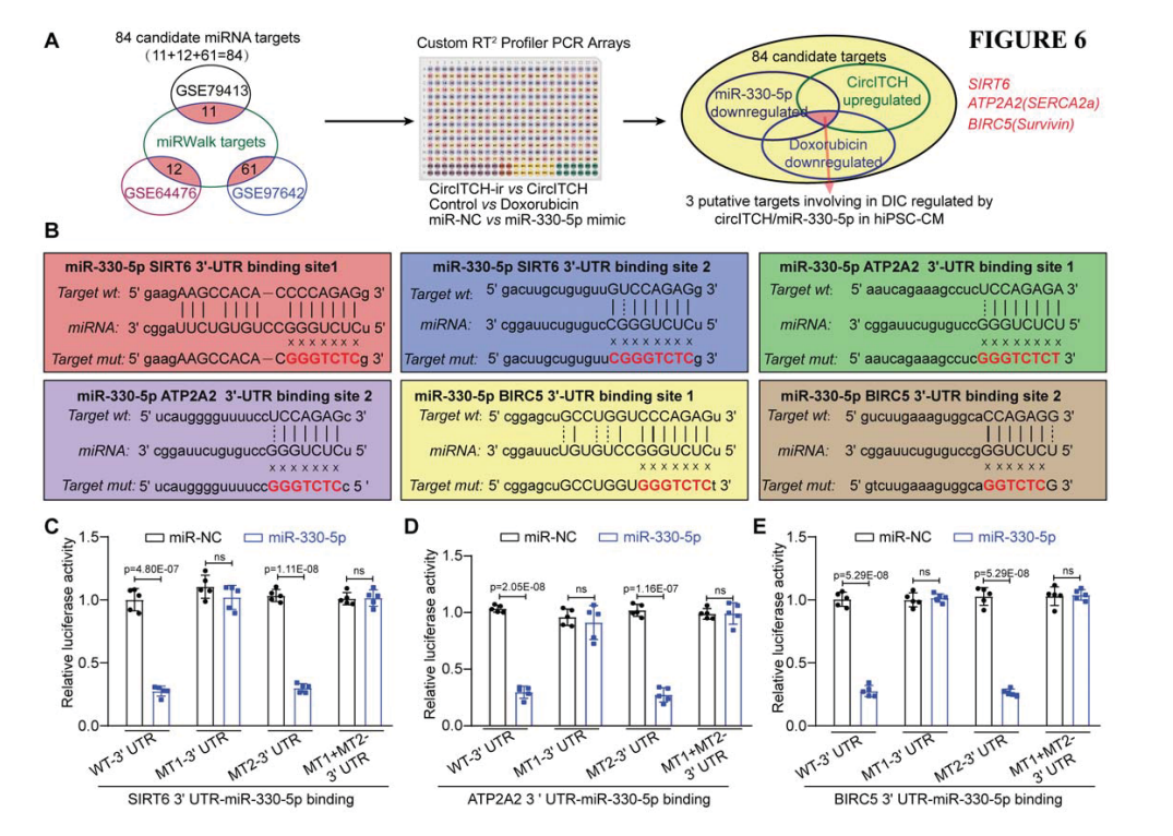 为了进一步了解介导CircITCH和miR-330-5p效应的信号分子,进行了以下分析。将miRWalk预测的靶标与GEO数据库(GSE79413、GSE64476和GSE97642)中DOXIC显著改变的蛋白质编码基因进行比较,选择了84个miR-330-5p的候选靶标。然后用Custom RT2 Profiler PCR阵列检测这84个靶标在CircITCH过表达、miR-330-5p过表达和DOX处理后的表达变化。根据“竞争内源性RNA(ceRNA)”机制的一般规律,即靶标mRNA的表达通常与circRNA的表达正相关,而与miRNA的表达负相关,在CircITCH上调靶标、miR-330-5P下调靶标和DOX下调靶标取交集。通过这种方式,作者确定了三个潜在的靶标,SIRT6、Survivin(BIRC5)和ATP2A2,它们受CircITCH/miR-330-5p轴的调控,可能参与DOXIC通路。接下来,通过进行计算机扫描分析和双萤光素酶报告实验,证实miR-330-5p与SIRT6、BIRC5和ATP2A2的3’UTR结合并抑制其翻译。为了进一步确定哪些位点参与miR-330-5p对三种靶标的抑制作用,位点突变结合双萤光素酶报告分析表明SIRT6、BIRC5和ATP2A2的3’UTR中的位点1在与miR-330-5p的相互作用是重要的。