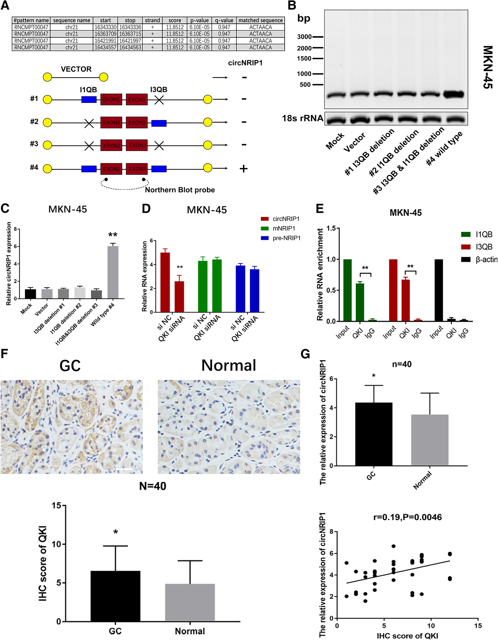 8. QKI是一种RNA结合蛋白,曾被报道主要调控circRNA的生物形成。为探讨QKI是否会通过靶向结合NRIP1 pre-mRNA,促进其生物形成。考虑到circNRIP1来源于母系基因NRIP1的2和3号外显子,从其上下游预测寻找QKI结合位点,发现两个结合序列存在剪切位点的上游1号内含子之中,故将包含这两个位点的序列统称I1QB,而两个结合序列存在剪切位点的下游3号内含子之中,故将包含这两个位点的序列统称I3QB。针对 I1QB和I3QB设计突变,验证这些位点对于circNRIP1形成的重要性。Northern blot和RT-qPCR实验证明I1QB和I3QB对于circNRIP1形成是缺一不可。敲低QKI表达只会影响circNRIP1的表达,而不会影响pre-mNRIP1和 mNRIP1的形成。RIP实验证明QKI可以结合I1QB和I3QB序列。IHC结果证明胃癌组织中QKI表达水平出现明显上调;RT-qPCR分析发现QKI表达与circNRIP1表达成正相关的关系。