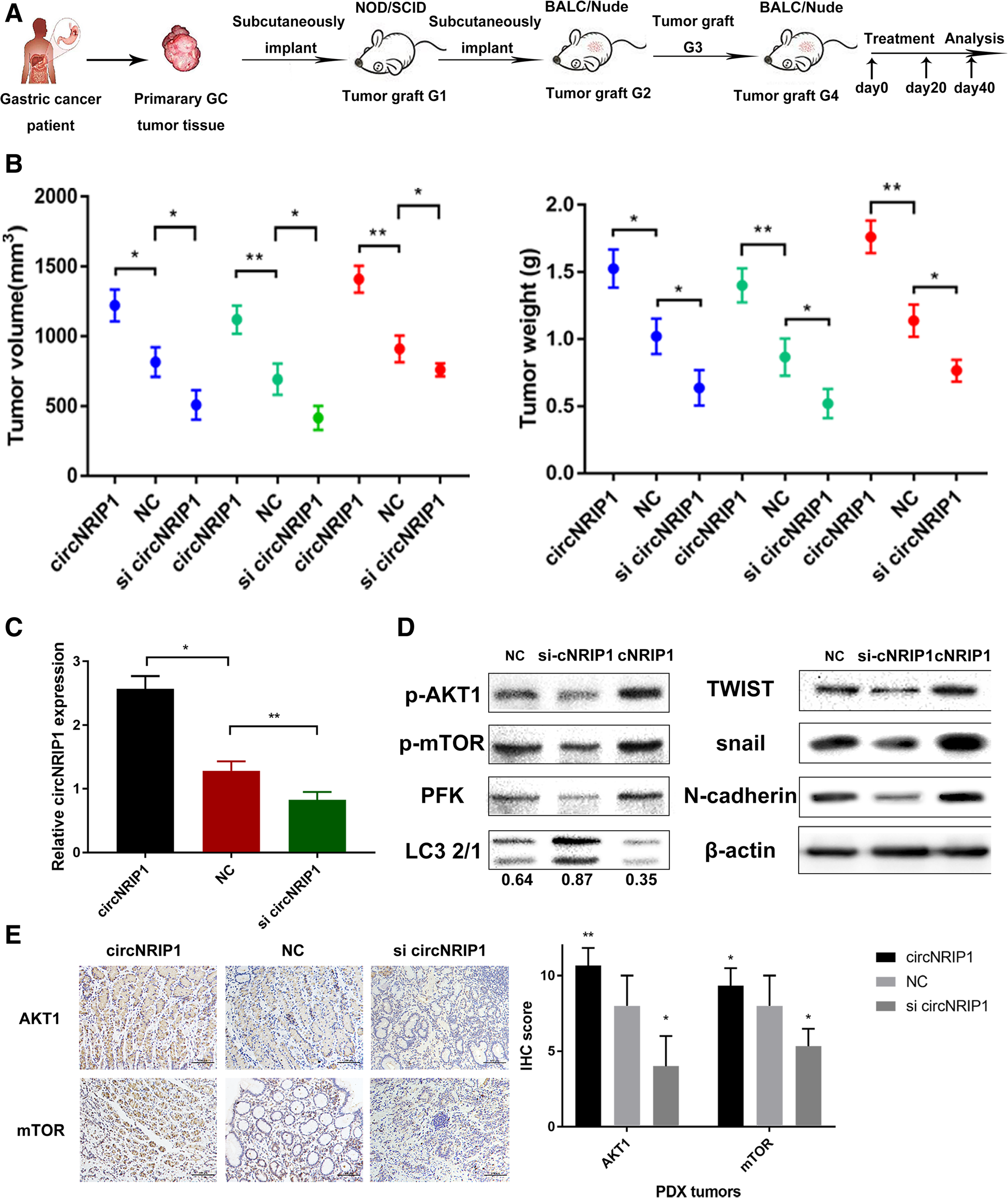 9. 体内实验:在异体移植小鼠模型的瘤内不断注射circNRIP1过表达质粒或者circNRIP1 siRNA,分析肿瘤体积和重量后发现过表达circNRIP1明显促进肿瘤的生长,而敲低circNRIP1明显抑制肿瘤的生长。circNRIP1过表达组的肿瘤组织中circNRIP1 mRNA水平明显上调,同时p-AKT1, p-mTOR, 和糖酵解基因PFK 的蛋白水平也明显上调,而自噬水平则被下调;circNRIP1表达敲低组的肿瘤组织则出现相反的结果。肿瘤组织的IHC结果与WB结果一致。