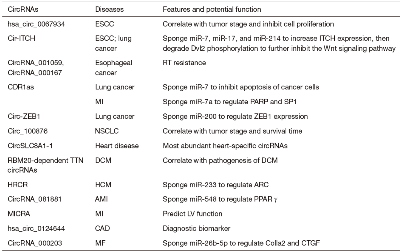 图15 胸部疾病相关circRNA汇总 (来自[15])