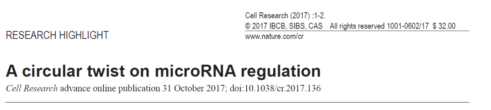 Cell Research发表了哈佛大学医学院Pier Paolo Pandolfi为通讯作者的circRNA研究亮点点评,点评了前段时间Sicence杂志发表的CDR1as基因敲除小鼠模型的文章[21]。