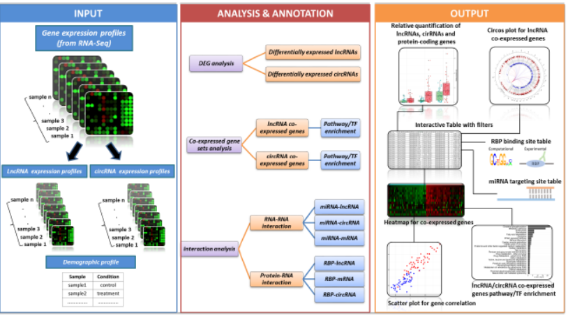 - 分析模块非常丰富,包括lncRNA组织表达热图、箱线图、共表达散点图、circos图,基因功能富集分析GO和KEGG图,还有RBP-RNA结合蛋白网络图,miRNA网络图等;