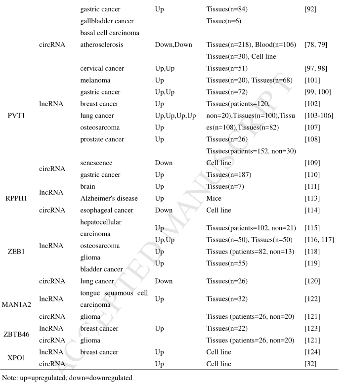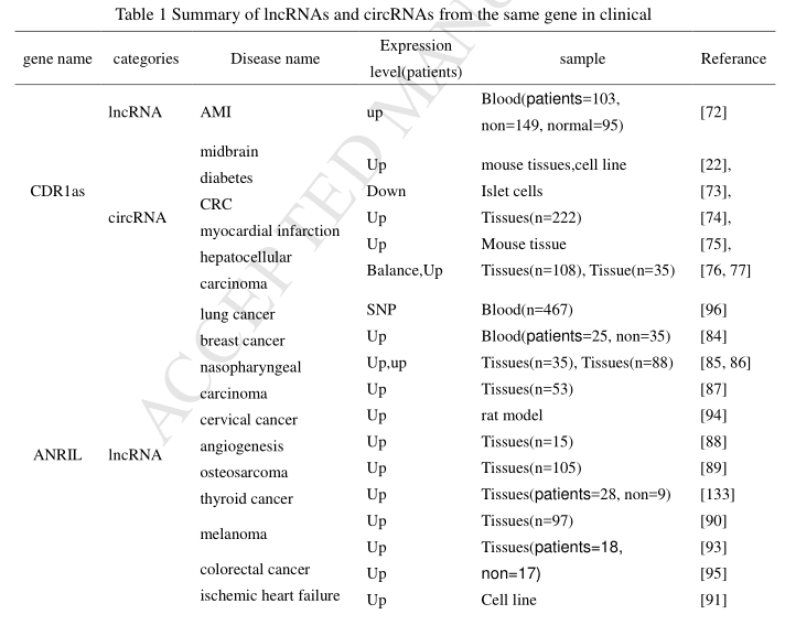 表1:目前相关临床研究报道的来源同一基因位置的lncRNA和circRNA汇总