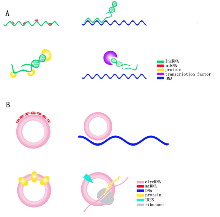 例如:CDR1AS既可以形成线性的长链非编码RNA-lncRNA又可以形成著名的环形circRNA-circCDRS1AS(别名ciRS-7),LncCDR1AS在AML(急性心肌梗塞)患者中表达水平异常升高,可作为急性心肌梗塞的潜在诊断标记物,ciRS-7含有70多个miR-7的结合位点,竞争性结合miR-7后,可影响中脑神经组织发育、提高胰岛素细胞分泌胰岛素、促进结肠癌发生、增加心肌梗塞风险和加剧肝癌发展等多种作用。